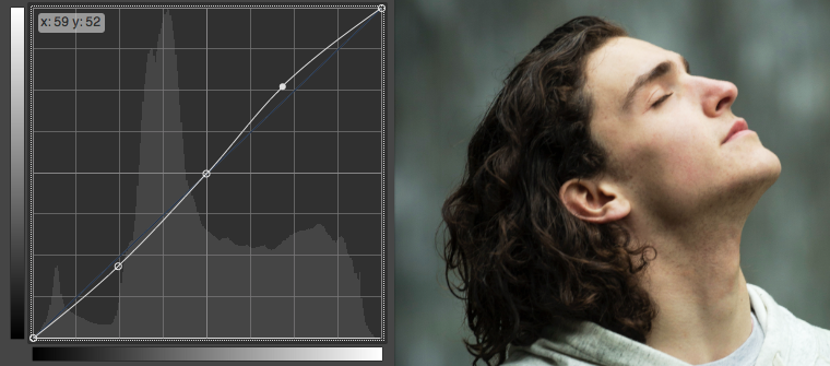 Vill du öka kontrasten mellan ljusa och mörka partier kan du klicka ut var sin punkt halvvägs mellan mitten och hörnen. Dra sedan den övre uppåt och den nedre nedåt så gör du mörkt mörkare och ljust ljusare, och kurvan ser nu ut som ett svagt S.